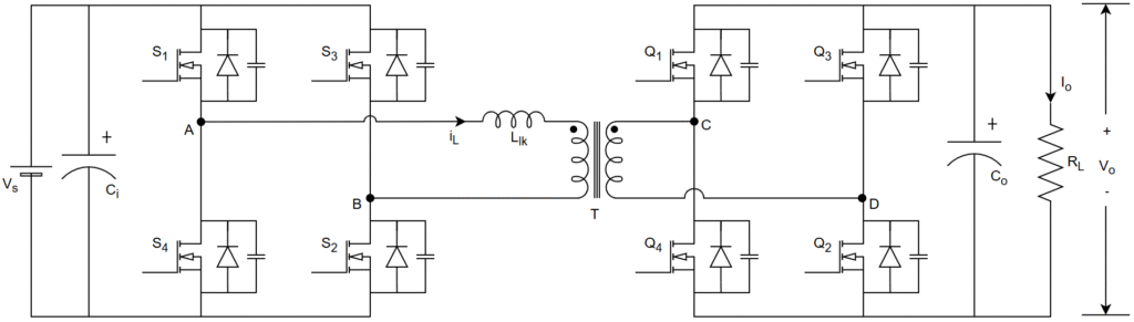 The circuit diagram of single phase dual active bridge (DAB) resonant converter is shown in below Fig. This converter is useful in bidirectional power flow in battery charging and discharging applications.