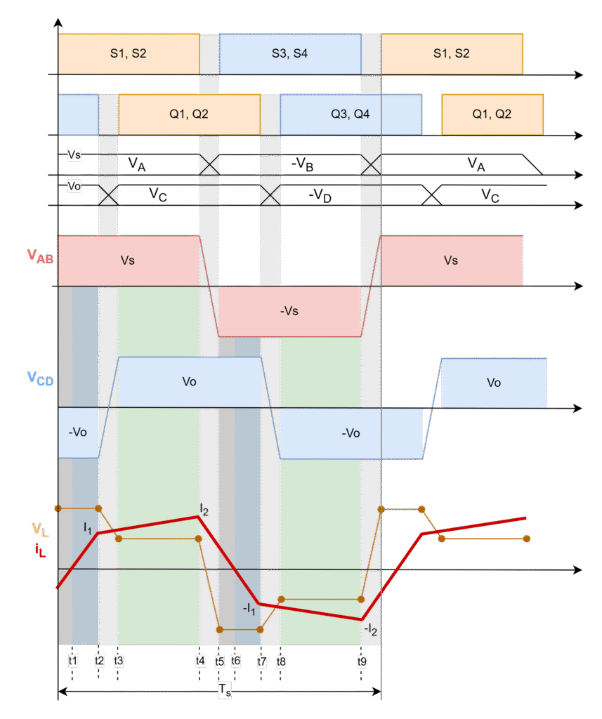 The switching sequence of DAB converter is divided into 10 intervals based on the