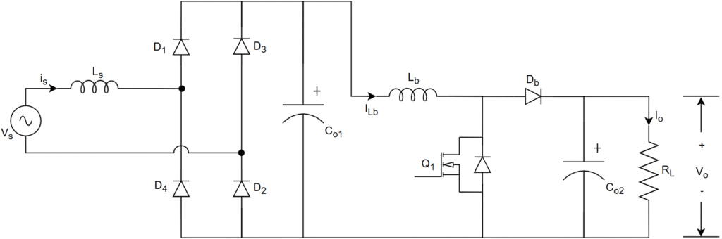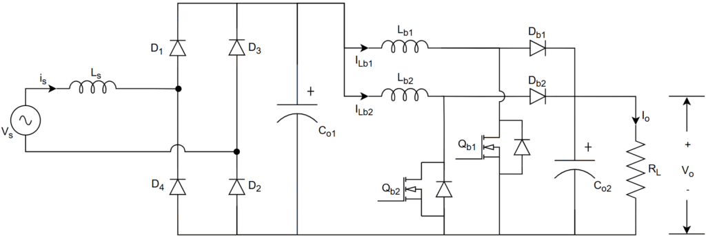 This is the basic PFC converter which is combination of diode bridge rectifier and boost converter. Simple structure and simple control due to single switch in boost converter.