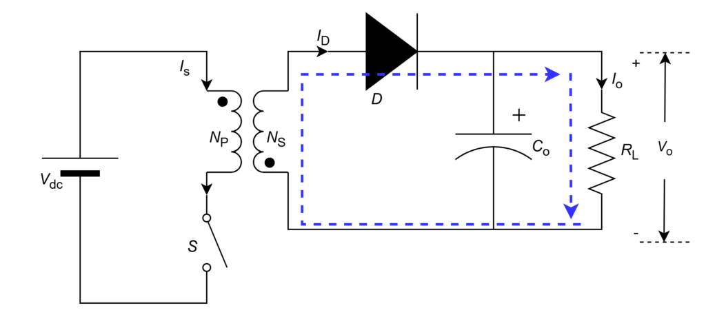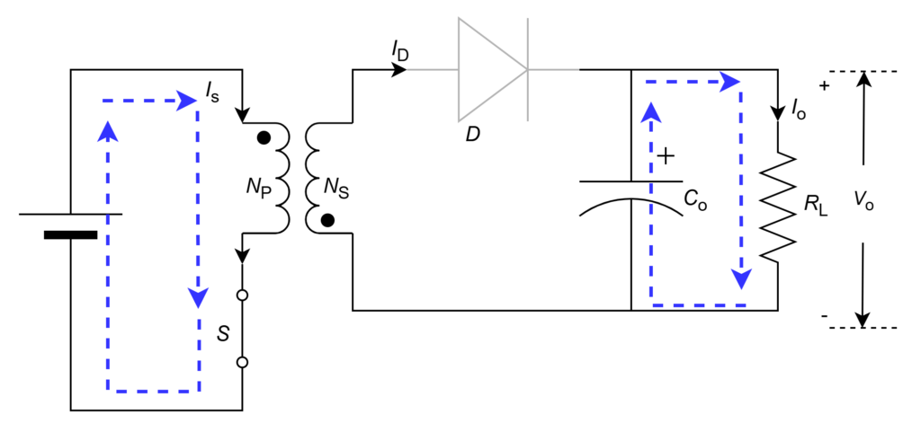 Since secondary winding is open and current is zero, input supply current cannot flow through primary winding also due to power balance of transformer windings. That means, entire input current flows through magnetizing inductance winding () and same through switch. This current ramps up slowly for entire duration of ON-period from zero when switch is closed (initially) and stores energy. The current path in this mode is shown in figure.