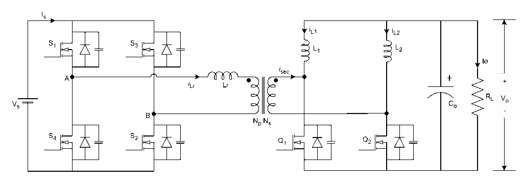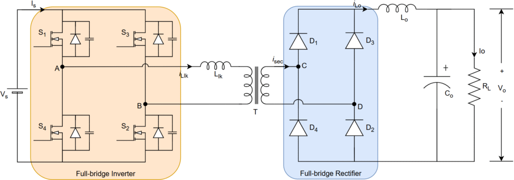 It is combination of full-bridge inverter (DC-AC), high-frequency transformer, and current doubler (AC-DC) with diodes/SR MOSFETs.