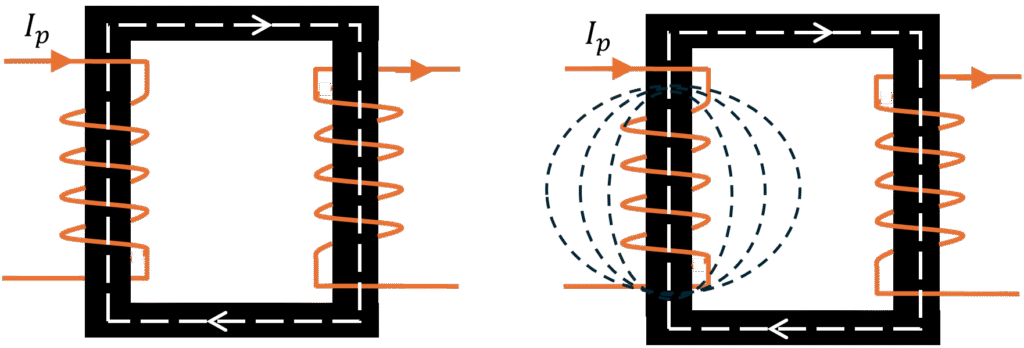 - When source and load are connected at the trasformer primary and secondary windings respectively, current starts flowing in the primary.