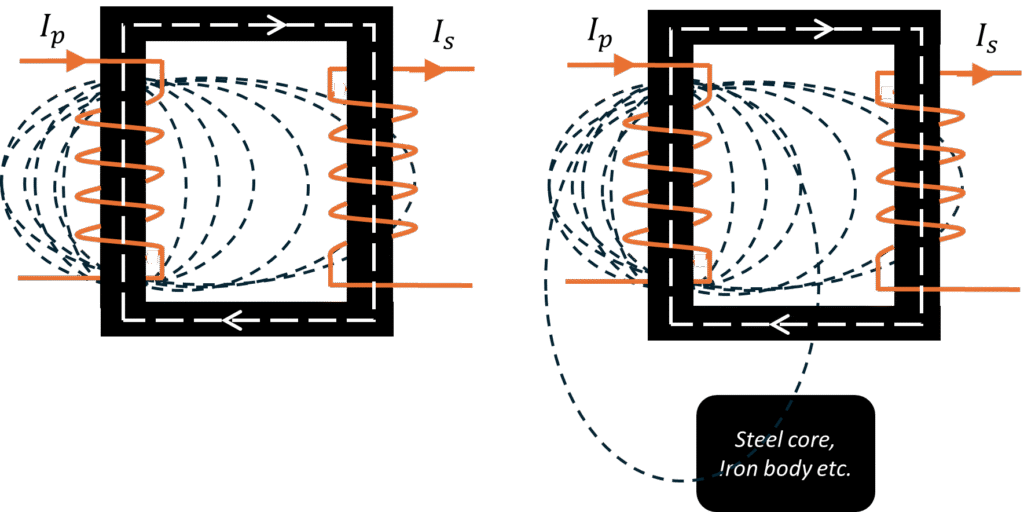 - Other than transformer two windings, steel/iron components will be there in the circuit.