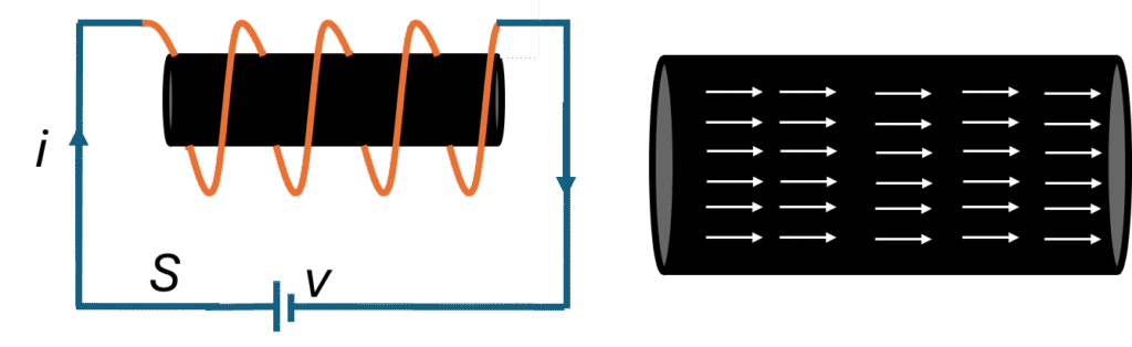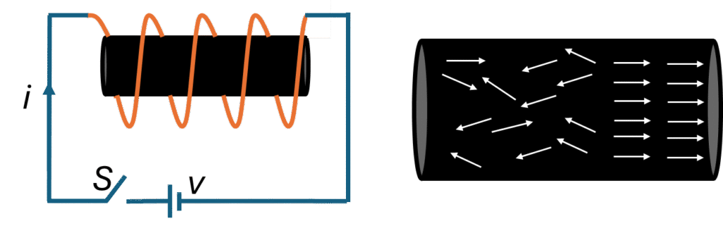 Once the switch is closed, current starts flowing through conductor around the magnetic core. The dipoles in magnetic core starts coming in one direction and align with current direction. Once all dipoles are in one direction, magnetic core is fully magnetized material.